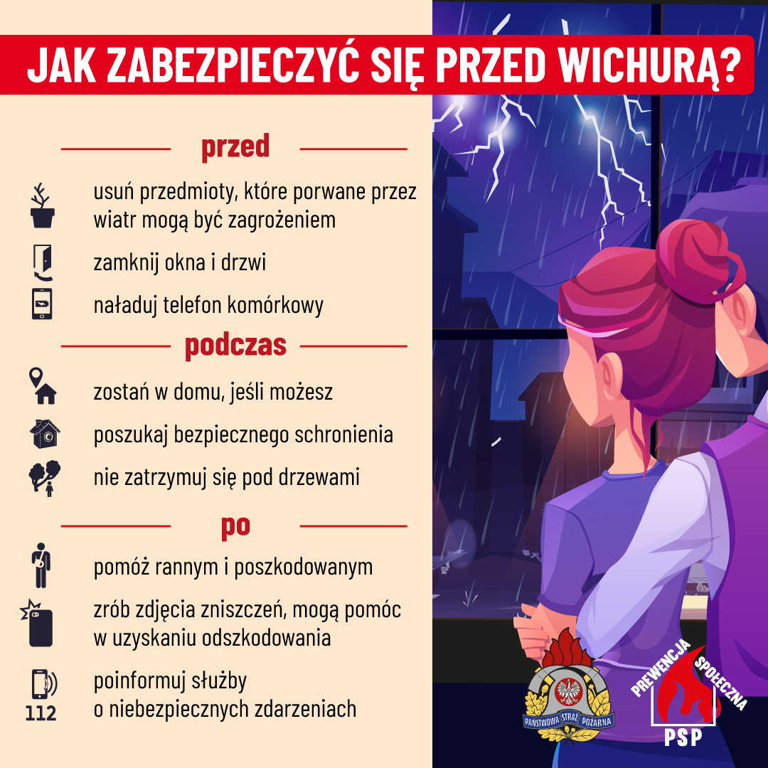 - Nie podchodź do okien i drzwi – obserwacja żywiołu może być niebezpieczna