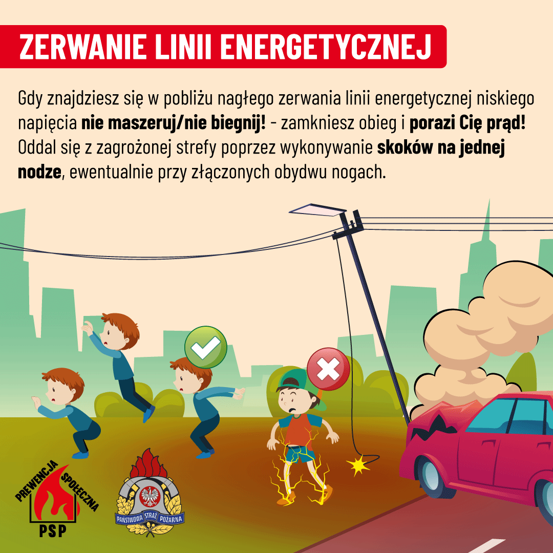 - Jeśli jesteś w samochodzie: zatrzymaj się z dala od drzew, słupów i linii energetycznych